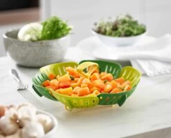 With its self-adjusting sides, heat-resistant silicone feet and silicone side fins, this folding steamer basket is perfect for using with both non-stick and stainless-steel cookware.