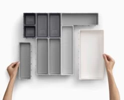 This clever drawer organisation set includes ten different sized trays that can be clipped together on all sides so you can easily arrange them in any order to fit your drawer space.