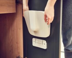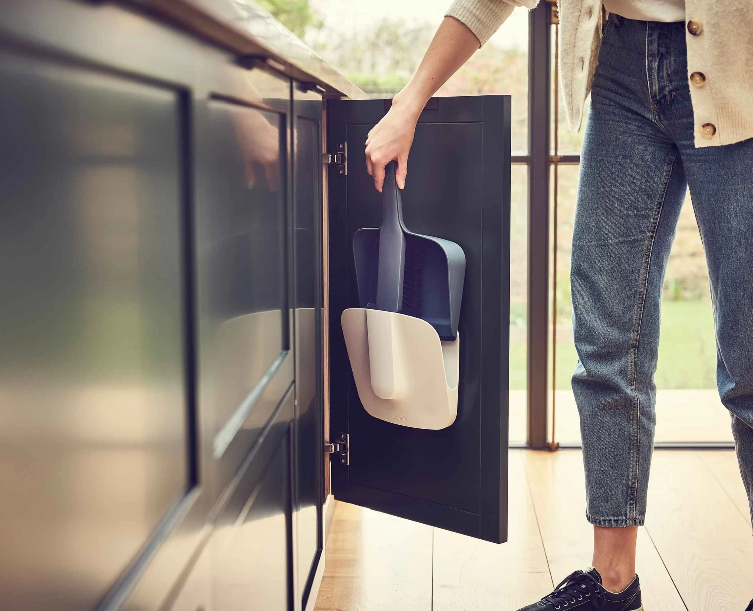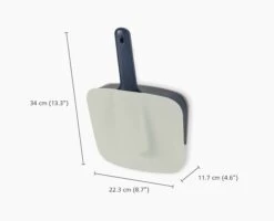 - Wall-mounted holder covers brush and pan for cleaner storage