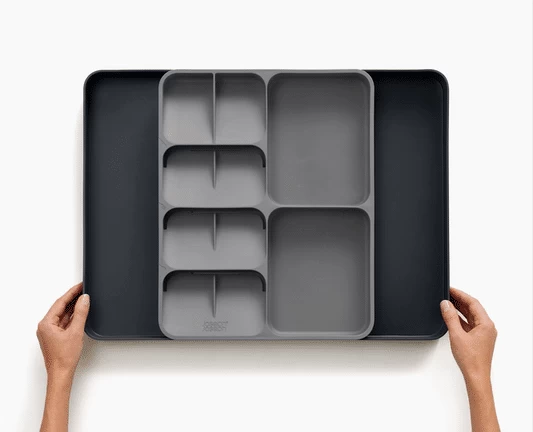 The unique design of this highly practical storage solution features five overlapping compartments for storing cutlery and two deep-sided compartments for holding gadgets so you can easily organise messy cutlery and utensil drawers.