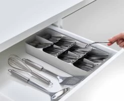 The unique design of this cutlery tray features angled compartments that layer on top of each other so more cutlery can be stored in less space.