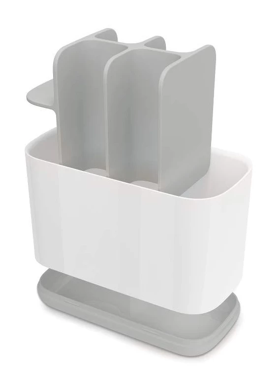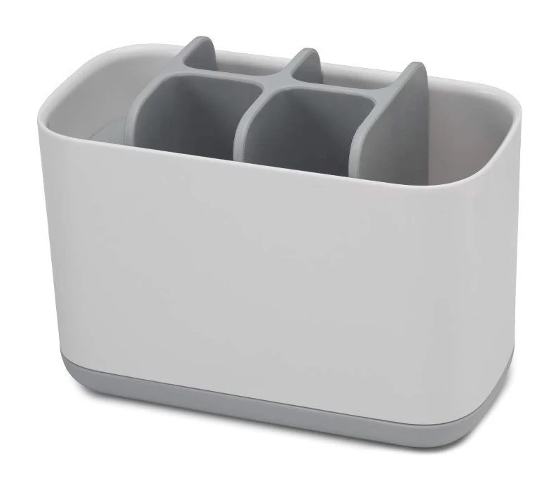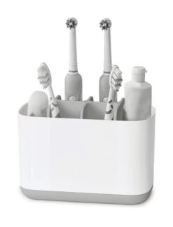 Joseph Joseph Easy-Store Large Toothbrush Caddy. Neat toothbrush caddies are divided into sections providing organised storage for a range of oral care items including manual/electric toothbrushes, toothpaste tubes and dental floss. They dismantle for easy cleaning and feature a ventilation hole for quick drying and non slip base.Â