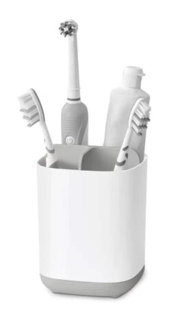 Joseph Joseph Easy-Store Large Toothbrush Caddy. Neat toothbrush caddies are divided into sections providing organised storage for a range of oral care items including manual/electric toothbrushes, toothpaste tubes and dental floss. They dismantle for easy cleaning and feature a ventilation hole for quick drying and non slip base.Â