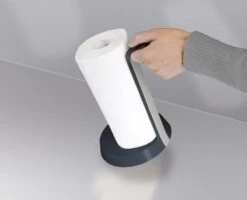 The clever design of this kitchen roll holder makes it easy to tear sheets off even if one hand is dirty.