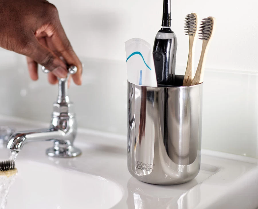 Polished stainless-steel toothbrush caddy provides organised storage for your toothbrushes and toothpaste tubes. Dismantles for easy cleaning.