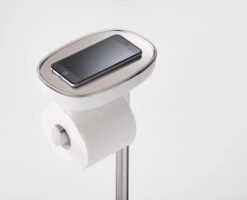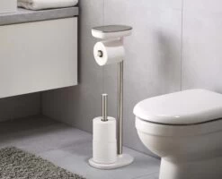 This freestanding toilet paper holder features a dual-purpose shelf and has space for storing up to 4 toilet rolls on its base.