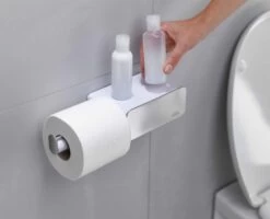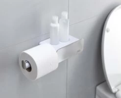 This smart wall-mounted toilet roll holder has several additional features including a handy storage shelf with an integrated small drawer beneath it that’s perfect for discretely storing sanitary items.