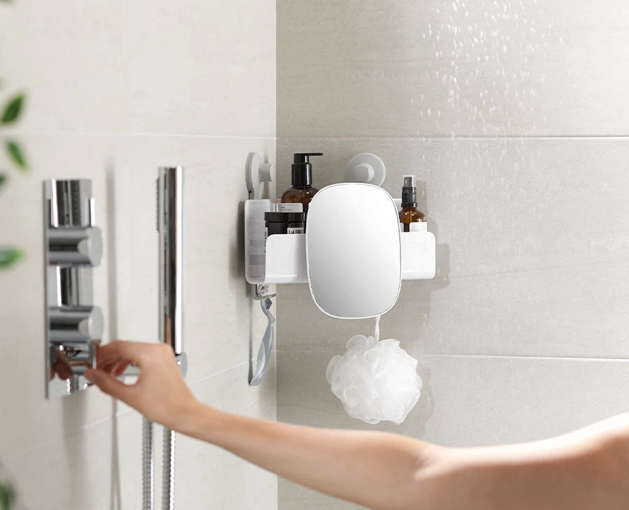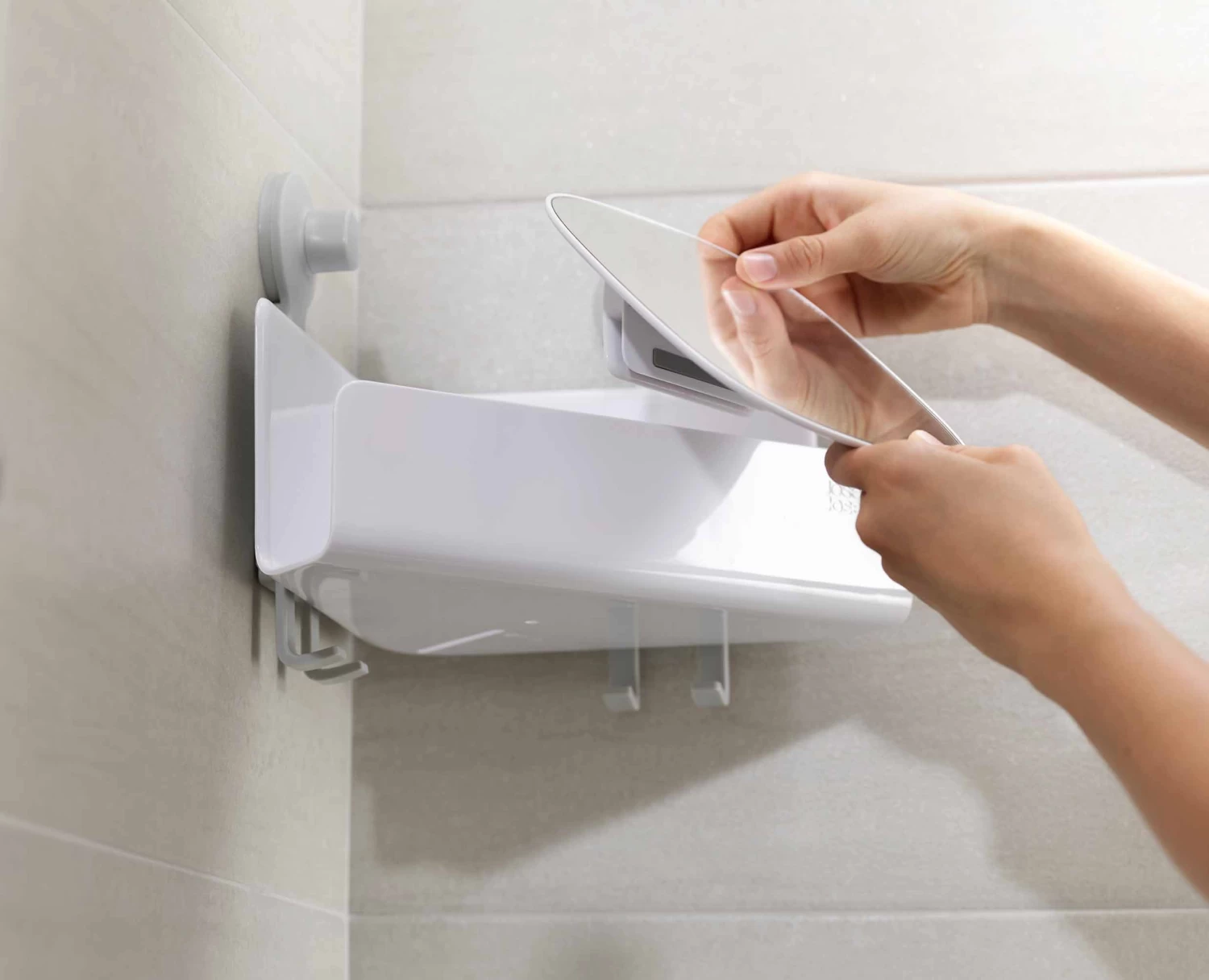 This corner shower shelf sits neatly in the corner of your shower to hold soap bars, shower gels and shampoo bottles and features hooks for razors, sponges and flannels and a hinged, removable, shatter-resistant acrylic mirror.