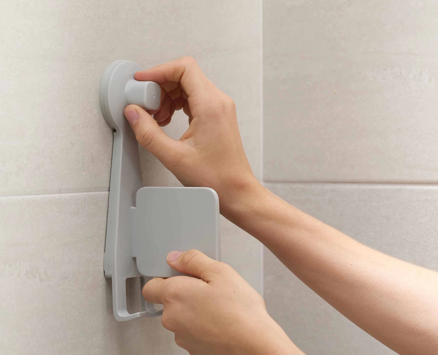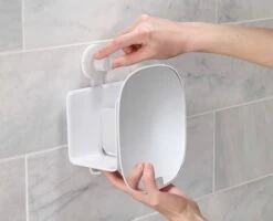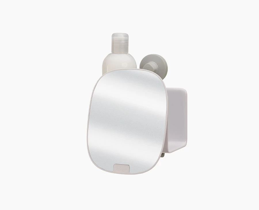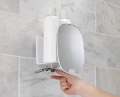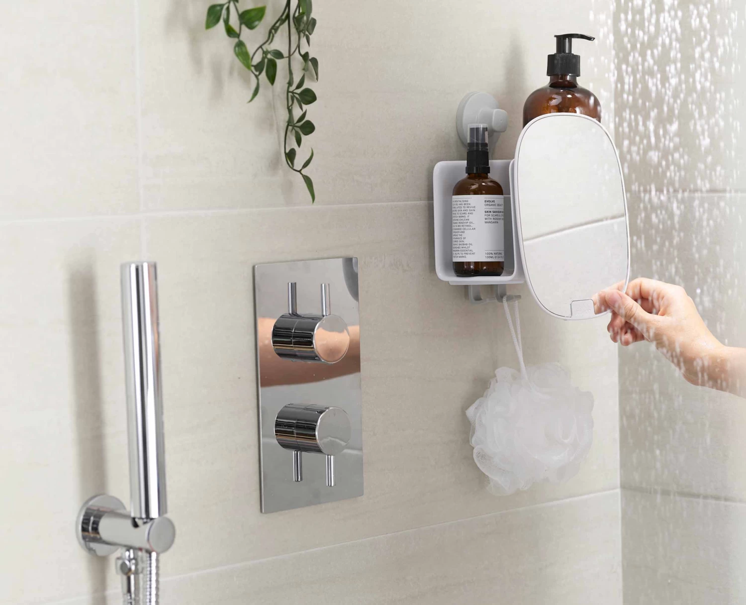 This compact shower shelf takes the hassle out of shower storage. It’s large enough to hold all your essential soap and shampoo bottles and features hooks for a razor, sponges and flannels and a hinged, shatter-resistant acrylic mirror.