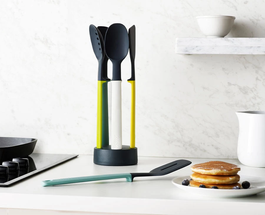 This kitchen tool set includes 5 essential utensils with an ultra-compact storage stand to store them in that saves space on your worktop.