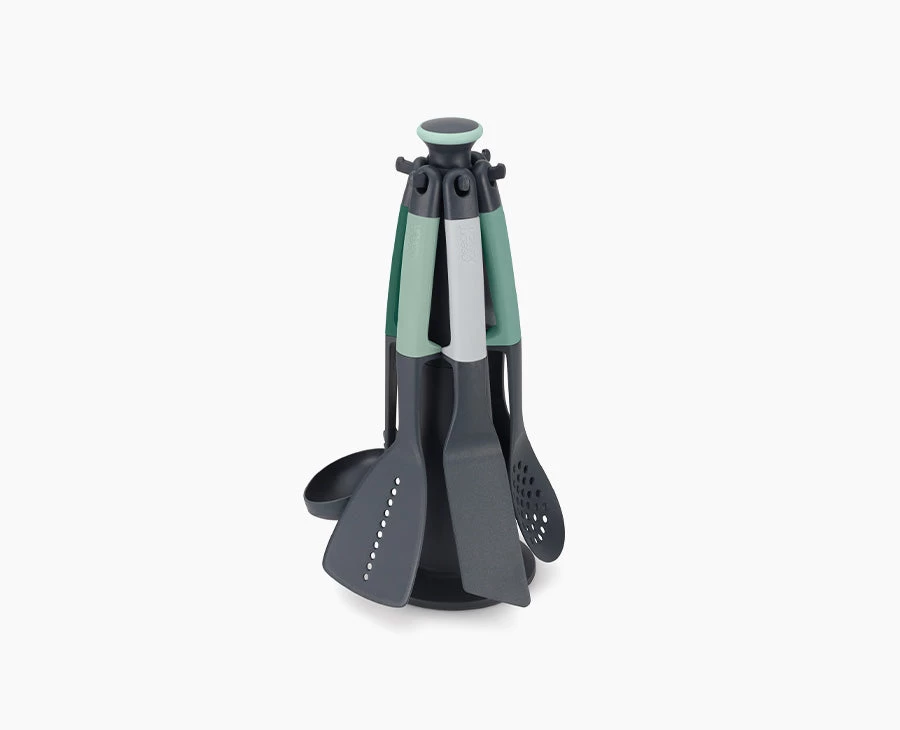 The utensils in this carousel set all have weighted handles that lift the head of the tool off of your work surface in order to improve hygiene and minimise the mess made when they’re placed down.