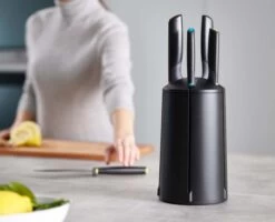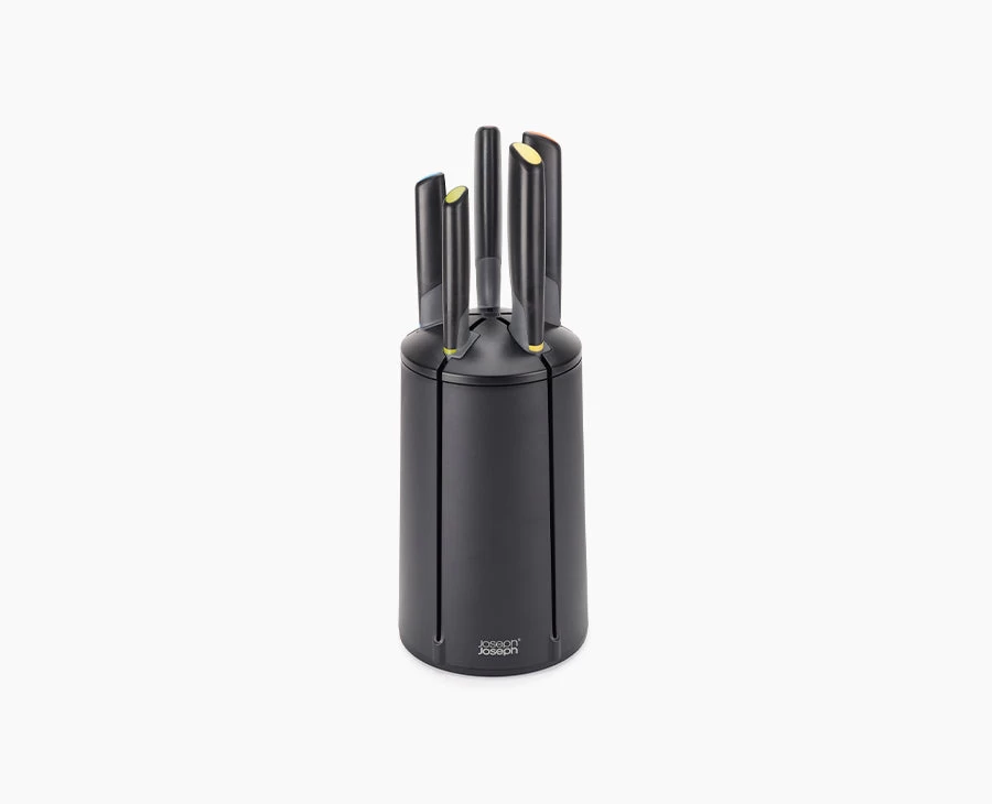 - Rotating knife block features vertical slots for easy access and has a non-slip base