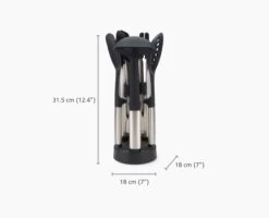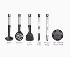 - Set includes solid turner, ladle, slotted spoon, precision tongs, large tongs