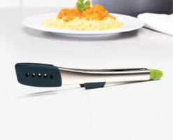 These Elevate⢠tongs are made from stainless-steel with silicone tips and can be locked or unlocked easily using the catch in the handle.
