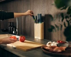 This set contains 5 essential kitchen knives with a slimline bamboo block to store them in that takes up less room on your worktop than conventional knife blocks.