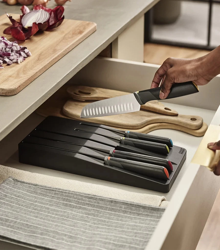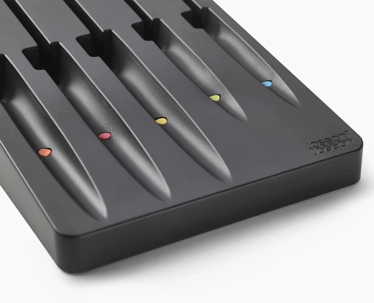 - In-drawer tray with colour-coded dots and non-slip feet for neat storage
