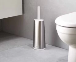 This toilet brush features a D-shaped, flexible head that makes it easier to reach all areas and comes with a slimline stainless-steel holder with a fingerprint-proof coating.
