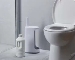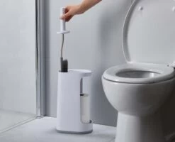This innovative storage solution comprises a revolutionary Flexâ„¢ toilet brush in a holder that features an extra-large caddy, which can hold up to three spare toilet rolls or a large cleaning bottle.