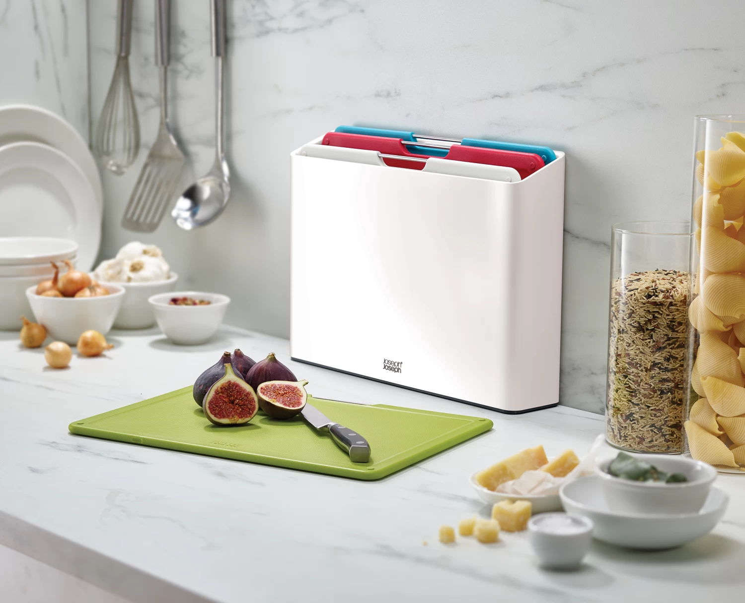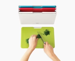 - Double-sided boards with knife-friendly, textured cutting surfaces and non-slip feet