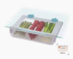 Innovative storage solution for your fridge. This drawer hooks neatly onto an existing shelf to hold a variety of fresh or packed foods.