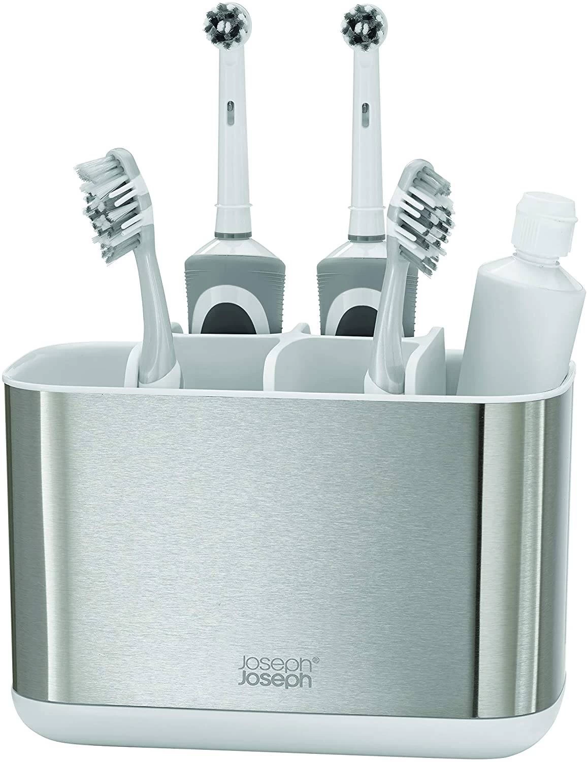 This large toothbrush caddy is divided into different sections to provide organised storage for a variety of oral care items, such as manual/electric toothbrushes and toothpaste tubes. It has a smart stainless-steel finish and features a ventilation hole for quick drying. Each unit also has a non-slip base and can be dismantled for easy cleaning.