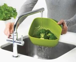 This clever colander has easy pour corners and a vertical handle that allows it to stand upright when placed down.