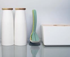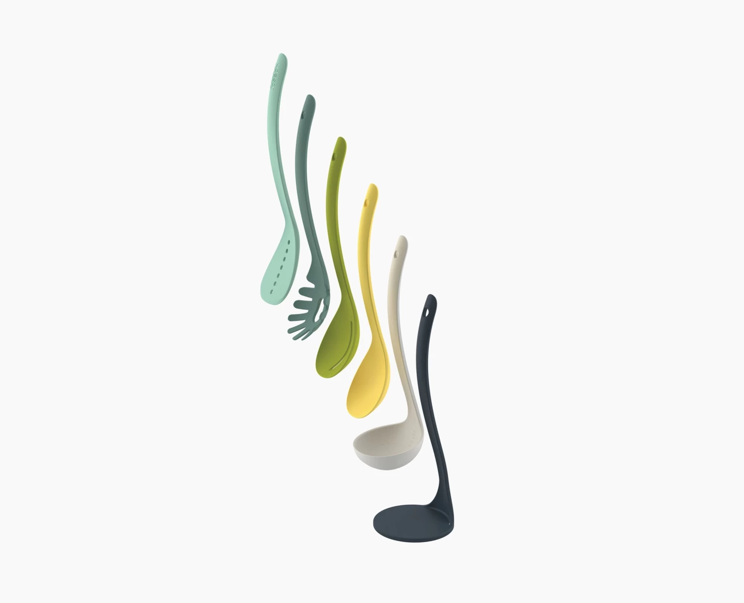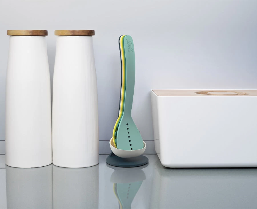 Perfect for keeping next to the cooker, this space-saving set is cleverly designed so the utensils stack neatly together and are held securely in place with their magnetic handles.