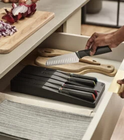 The Joseph Joseph Elevate Carousel set comprises of 6 essential kitchen utensils: spaghetti server, slotted spoon, ladle, solid spoon, slotted turner, and a flexbile turner. Each utensil has a silicone and heat-resistant handle with vibrant colours to add a dash of colour to your kitchen. Each one also includes a tool rest and a weighted handle so the head of the tool does not touch the work surface, reducing mess and improving hygiene. The utensil set comes with a rotating carousel stand so you can store your utensils stylishly in your kitchen. The ideal house-warming gift!