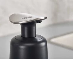 This hygienic soap dispenser features an extra-large pump head which makes it easy to operate with the wrist or forearm when your hands are messy.