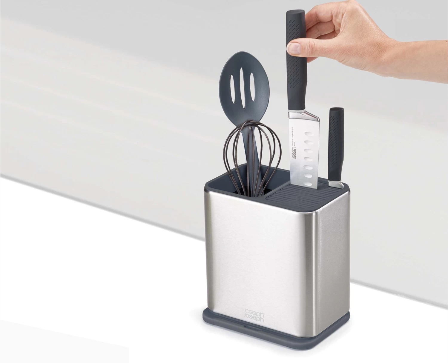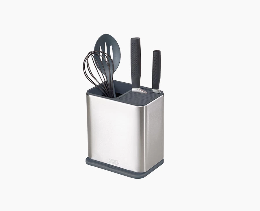 This utensil pot is conveniently split into two sections, one provides storage space for a range of different kitchen tools while the other has a number of slots for sharp knives.