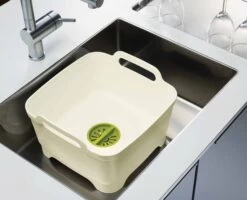 This smart washing up bowl comes with its own strainer plug, meaning you won’t have to lift to drain and can stop food blockages in your kitchen sink.